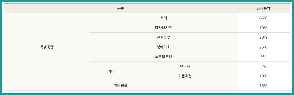 - 특별공급 : 다자녀가구, 국가유공자, 노부모 부양자, 신혼부부, 외국인, 생애최초 주택구입자, 기관추천자, 철거주택 소유자 및 세입자 등을 대상으로 주택 공급