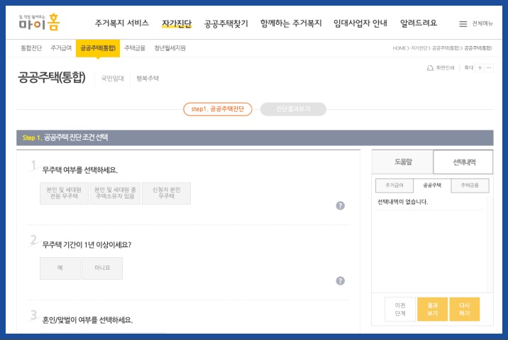 입주자격을 확인해 볼 수 있는 자가진단 사이트를 소개해드리겠습니다. 아래 마이홈 홈페이지에 들어가시면 입주자격 자가진단뿐만 아니라 자가진단을 통해 신청 가능한 모집공고까지 확인해 보실 수 있습니다.