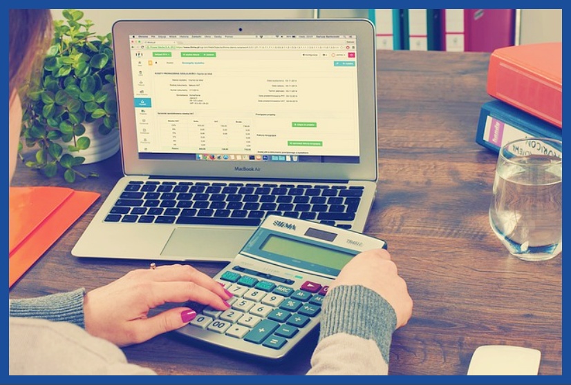 노트북과 계산기를 두드리는 사람빨간색 계산기와 볼펜시소 위 덧셈과 뺄셈